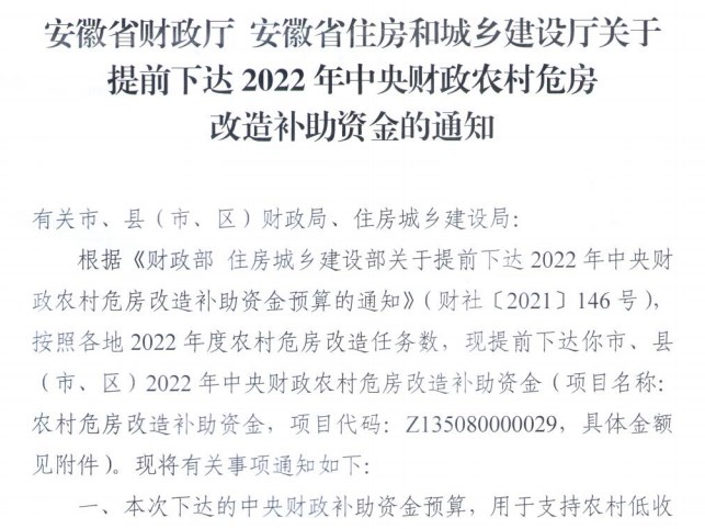 【資金使用和管理】安徽省財政廳 安徽省住房和城鄉建設廳關于提前下達2022年中央財政農村危房改造補助資金的通知