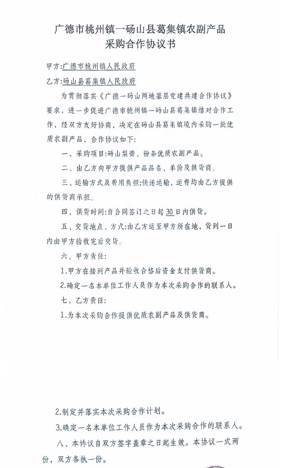 名稱: 桃州鎮(zhèn)對(duì)口幫扶碭山縣葛集鎮(zhèn)農(nóng)副產(chǎn)品采購(gòu)協(xié)議 文號(hào): 無(wú)