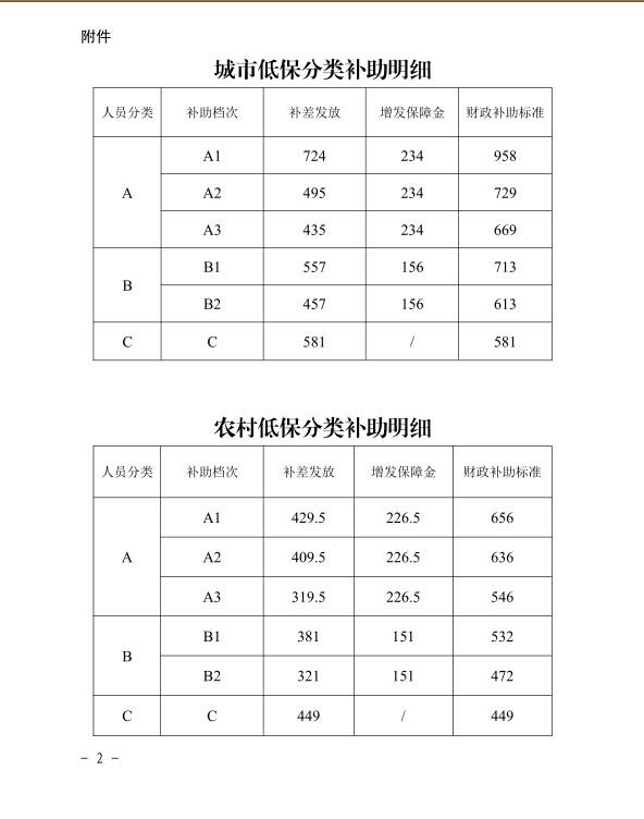 (一)城市居民最低生活保障標準調整為780元/月·人,農村居民最低生活保障標準調整為755元/月·人。A、B類人員分別按保障標準的30%、20%增發低保金。