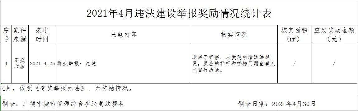 廣德市2021年4月份違法建設舉報獎勵情況