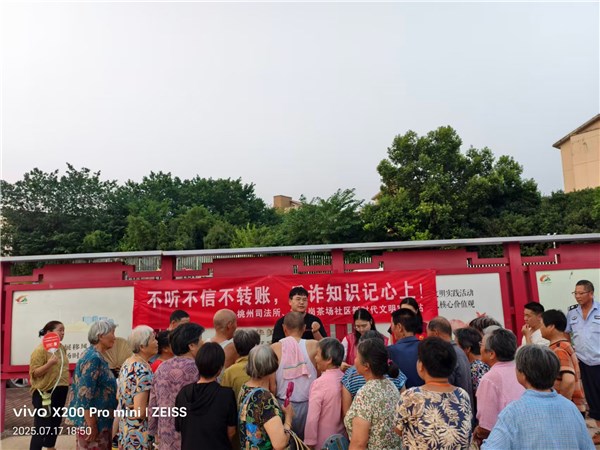 7月17日晚,廣德市桃州司法所在祠山崗茶場社區文化廣場開展反詐宣傳走進居民區活動,宣傳發放宣傳品120份,惠及群眾200余人。
