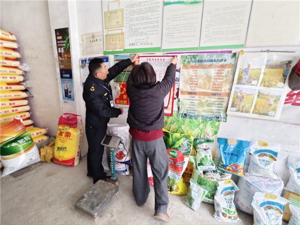 檢查人員走進農資經營店,重點核查禁限用農藥銷售、經營臺賬記錄、限用農藥專柜管理等問題,現場張貼禁限用農藥名錄,掐斷不合格農資流入田間的源頭。