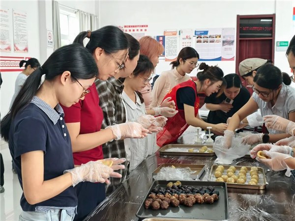 在老師的指導下,大家紛紛動手實踐。取面團、揉光滑、包餡料、壓模具,看似簡單的步驟,實則頗有講究。有的職工在包餡時反復摸索手法,有的為做出完整花紋多次調整壓模力度,現場不時響起“這個面劑怎么包才勻稱”“模具要怎么拿才不粘”的請教聲,經驗豐富的職工主動分享技巧,彼此協作互助,氣氛輕松熱烈。不一會兒,一個個月餅坯陸續成型,蛋黃蓮蓉的綿密、金腿五仁的醇厚、低糖豆沙的清甜,不同餡料在手中綻放出獨特韻味。