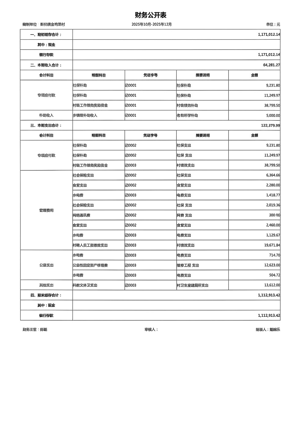 新杭鎮(zhèn)金雞籠村2025年四季度財(cái)務(wù)收支明細(xì)