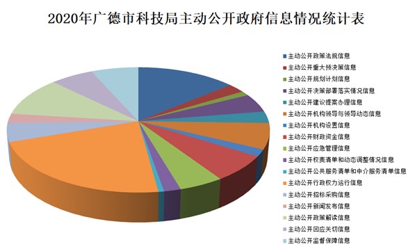 (一)主動公開。2020年,廣德市科技局在市政府信息公開網上發布和更新信息165條,其中政策法規信息23條,重大預決策信息4條,規劃計劃信息2條,決策部署落實情況信息8條,建議提案辦理信息5條,機構領導與領導動態信息11條,機構設置信息3條,財政資金信息11條,應急管理信息8條,權責清單和動態調整情況信息3條,公共服務清單和中介服務清單信息1條,行政權力運行信息36條,招標采購信息8條,新聞發布信息4條,政策解讀信息17條,回應關切信息10條,監督保障信息11條。